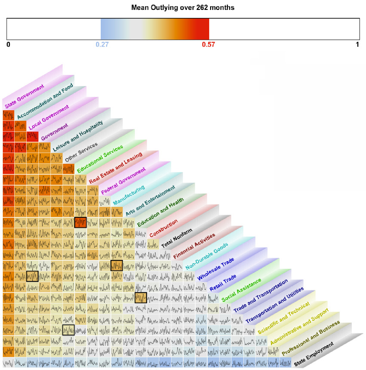 The US Employment data comprise monthly employment rates of various economy factors for 50 states over 22 years from 1990 to 2011.